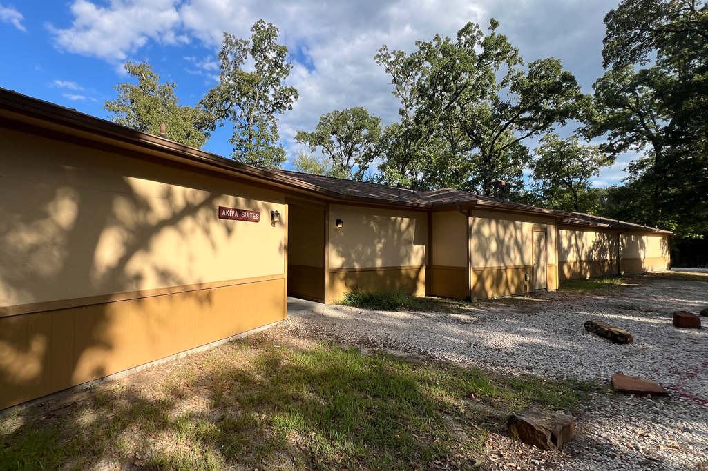 Sleeps 52 total in twin sized bunk beds. This is a mini version of the dorm. It has 2 wings with a common meeting room in the middle. The luxurious feature is the back deck which overs a great spot for small group discussions around a fire. Click images below to enlarge.
