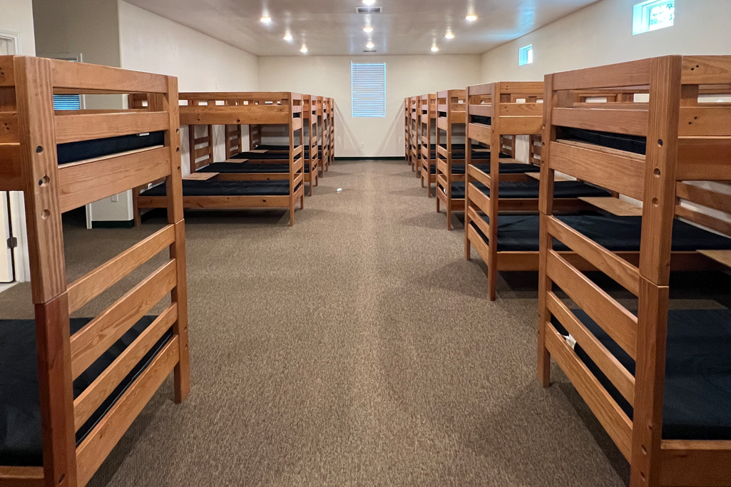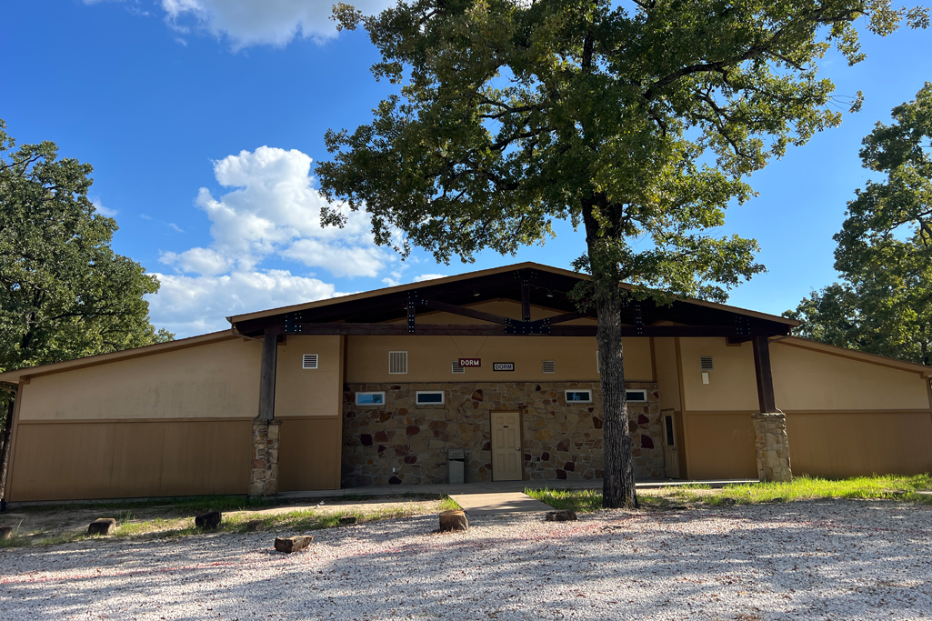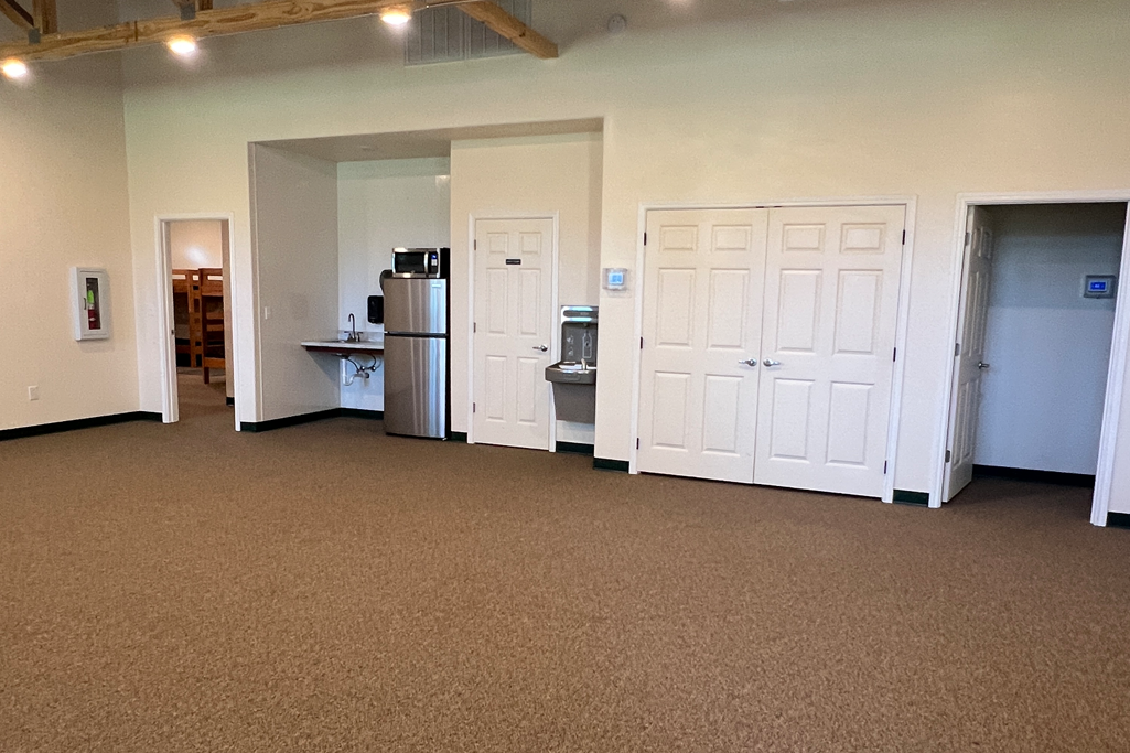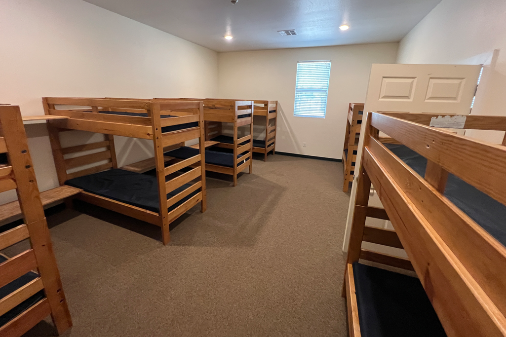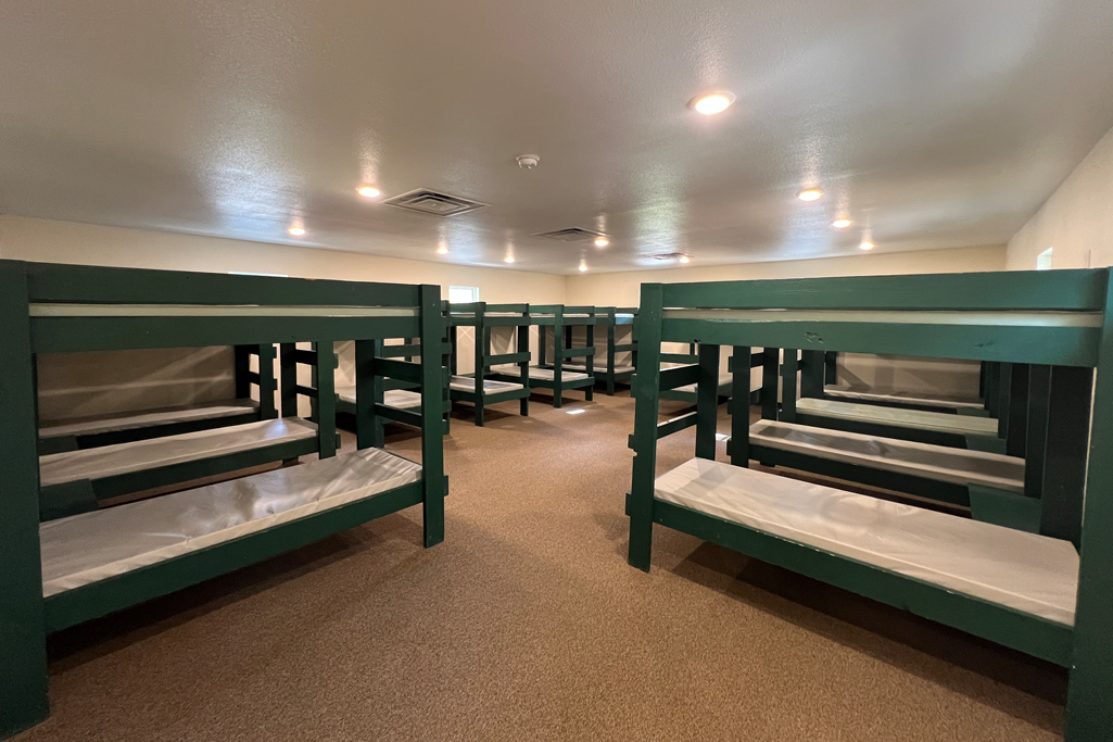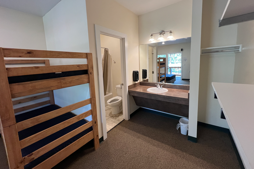 Sleeps 144 total in twin sized bunk beds. This large building has 2 wings with 6 rooms of 12 with a common meeting room in the middle. Minimum group size is 60. Click images below to enlarge.